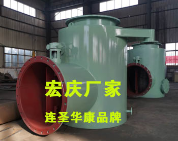 4、分匯器是一個三通閥,通過導(dǎo)向板的切換可使膠球進(jìn)入需要清洗的一側(cè)凝汽器中工作。一般一臺機(jī)組需兩臺分匯器,其進(jìn)口通徑為DN100,分配口為DN89,膠球投用時可通過窺視窗觀察運(yùn)行情況。FH型分匯器(清潔海綿膠球切換三通管閥)